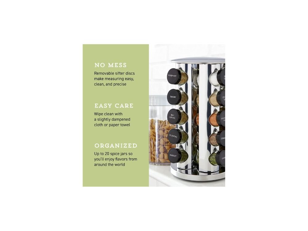 Overall, the Kamenstein 20-Jar Revolving Countertop Spice Rack offers an excellent balance of style, convenience, and functionality. It helps keep your spices organized, saves valuable space, and enhances your cooking efficiency. While it may have a few minor limitations, its advantages make it a reliable and attractive addition to any kitchen. If you are looking for a simple yet effective way to improve your kitchen setup, this spice rack is definitely worth considering.