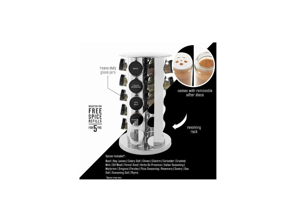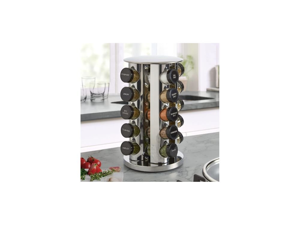 In addition to its practical benefits, the Kamenstein 20-Jar Revolving Countertop Spice Rack also enhances the visual appeal of your kitchen. The polished stainless steel finish gives it a modern and elegant look that complements a wide range of kitchen styles. Whether your kitchen is contemporary or more traditional, this spice rack blends in seamlessly while adding a touch of sophistication.
